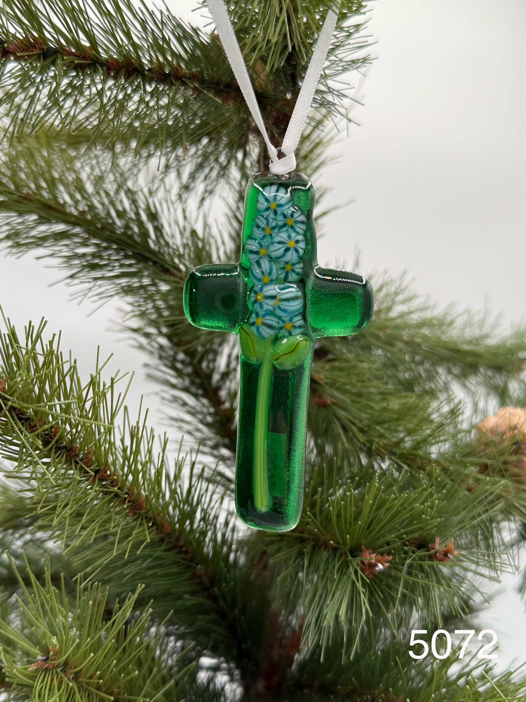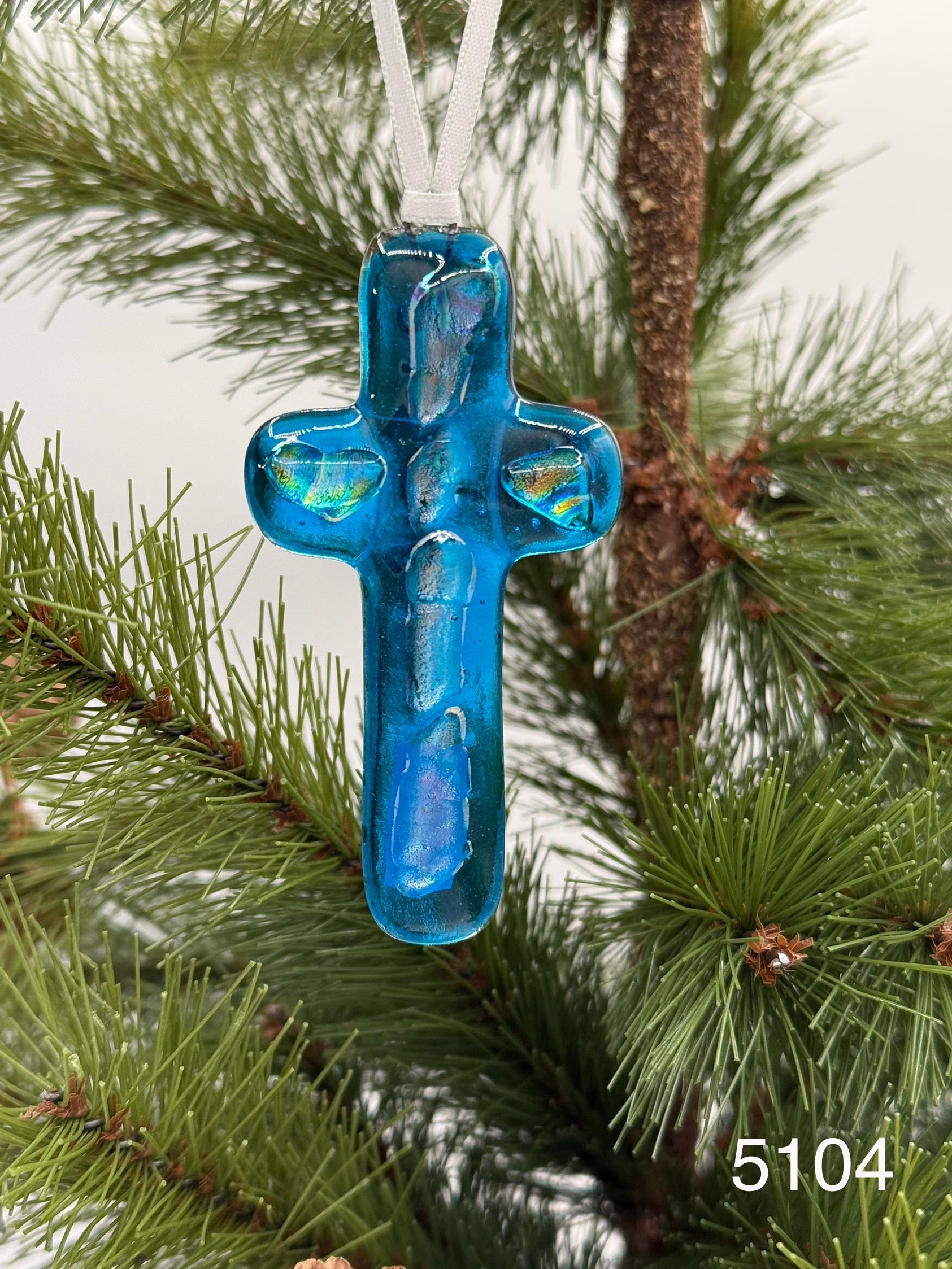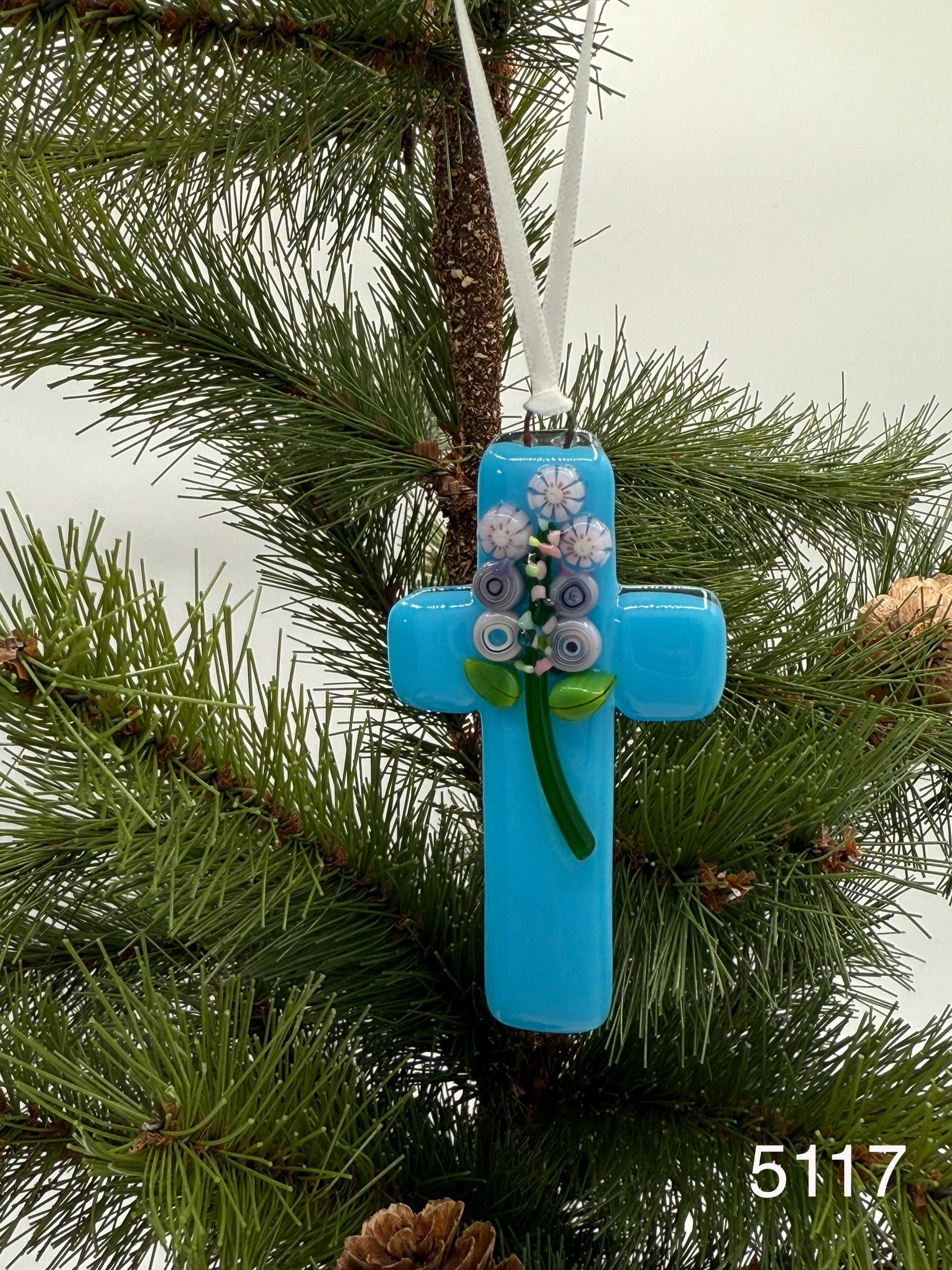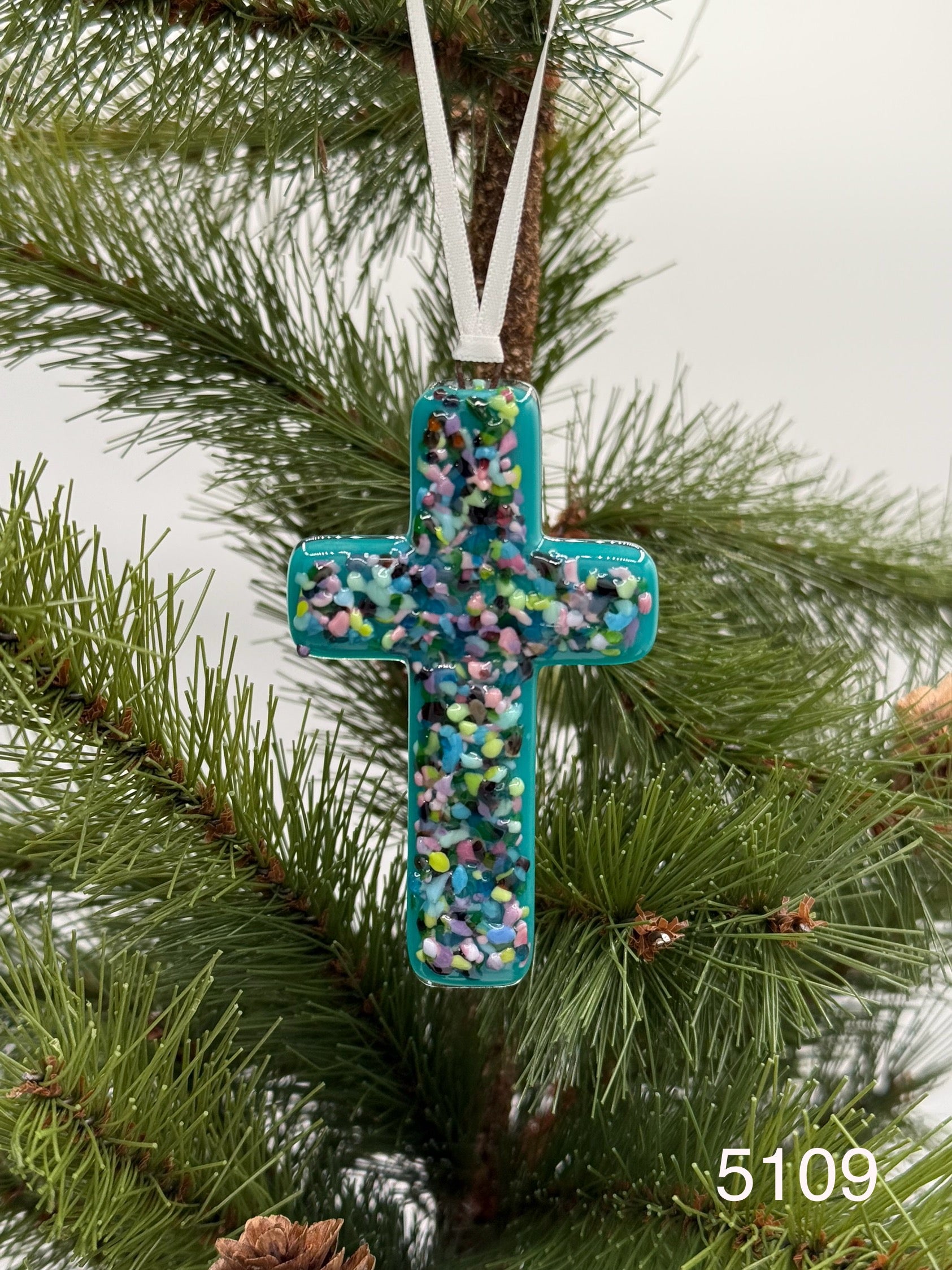 Add a splash of color and charm with these lovely fused glass crosses! Perfect as cheerful tree ornaments, eye-catching wall hangings, or unique pendants, they bring a fun and creative touch wherever you choose to display them. Approximately 3.5" x 1.5"