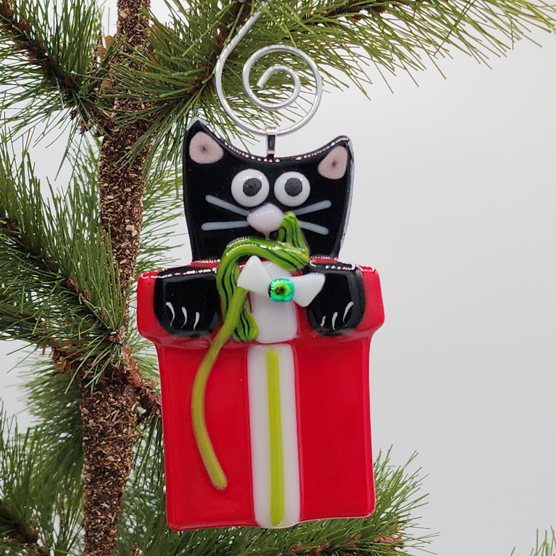 Add a dash of holiday mischief with the Kitty Khaos Surprise! ornament. This 2025 limited edition captures a curious cat caught in the act of unwrapping a present—wrapping herself in festive paper. Perfect for cat lovers, it brings playful chaos and charm to your Christmas tree, making every glance a joyful surprise. This ornament is part of the 2025 Limited Edition "Kitty Khaos" series; each is signed, dated and numbered. Only 25 of each style will be made. As with all glass art, the perfection is found in its imperfection. No two will be alike, all will be handcrafted with love. Approximately 3 1/2"